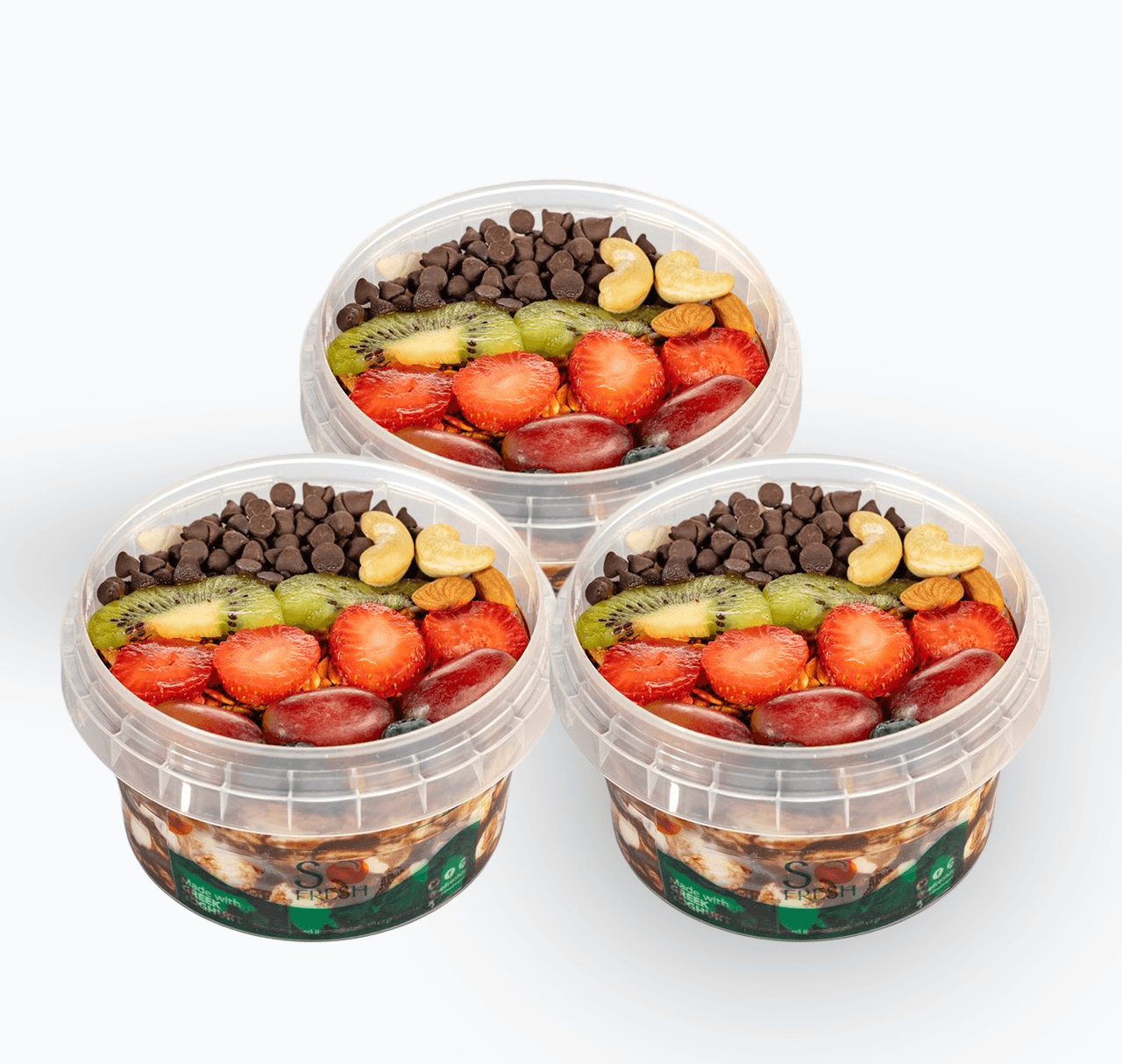 Roasted Coconut Flakes, Granola, Grapes, Kiwi, Strawberry, Blueberry, Almond, Cashew nuts, Apples, Chocolate chips, Puree/Chocolate drizzle in Greek Yoghurt