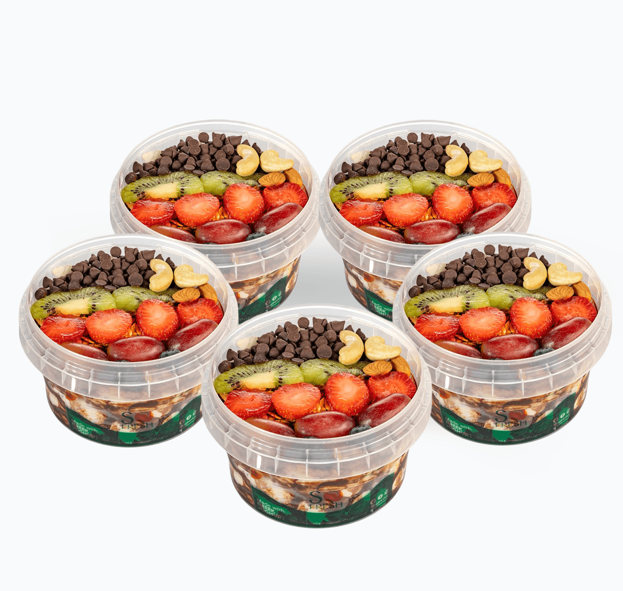 Roasted Coconut Flakes, Granola, Grapes, Kiwi, Strawberry, Blueberry, Almond, Cashew nuts, Apples, Chocolate chips, Puree/Chocolate drizzle in Greek Yoghurt